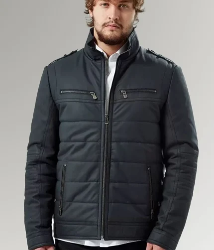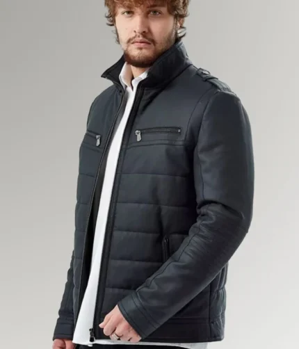 Johnston Men’s Navy Blue Quilted Puffer Leather Jacket