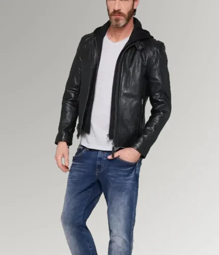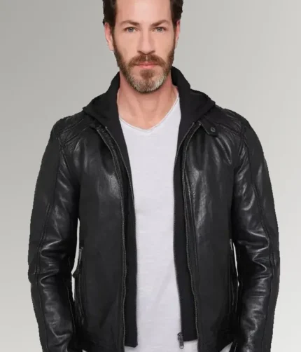 Ortiz Men’s Black Leather Hooded Jacket