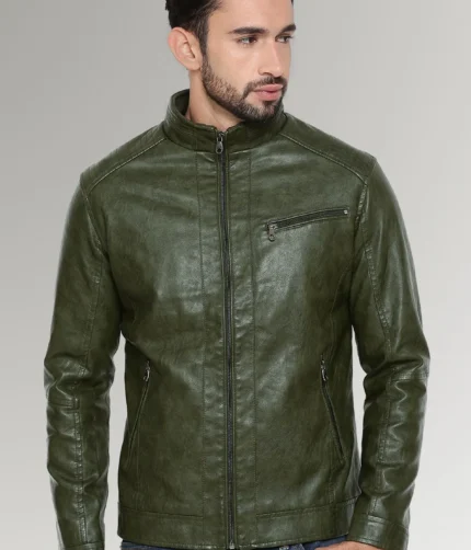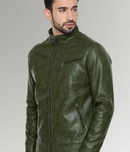 Baker Men’s Green Slim Fit Biker Waxed Leather Jacket