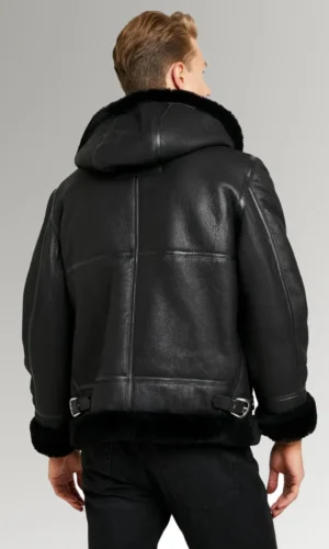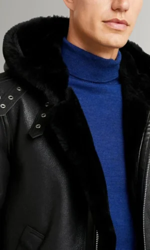 Black shearling leather jacket with a black hood, featuring the Cooper Black B3 Bomber design. There is nothing in fashion that is simultaneously more eco-friendly and on-trend than a leather B3 Bomber Black Hood Shearling Jacket. If you want to put up a good battle against the elements and your rivals, you really need to get your hands on one of Super Jacket’s B3 Bomber Black Hood Shearling Jackets. The each Roger Black B3 Bomber Real Shearling Jacket is one of the exclusive masterpieces created by Super Jackets. It is a bomber jacket style that features real shearling and will immediately improve the way you look.