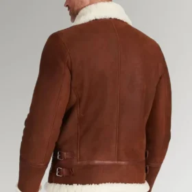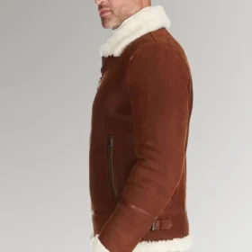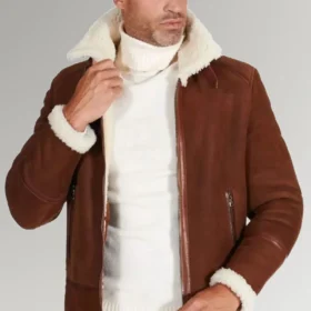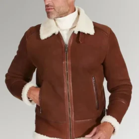Bennett Men’s Brown Shearling Leather Jacket with a fur collar and front zipper closing. It is named after the actor Bennett. There are two pockets on the exterior, and the two pockets on the interior are very spacious each. On chillier days, the shearling lining will keep you toasty and comfortable all day long. Those who want to seem sophisticated and fashionable at the same time will find that the fit of this garment is suitable for them. The full sleeves provide additional warmth.