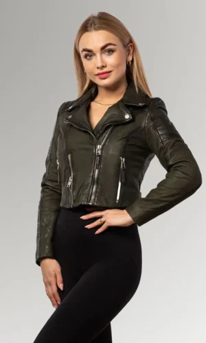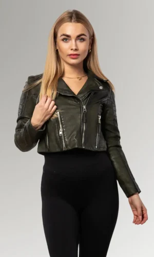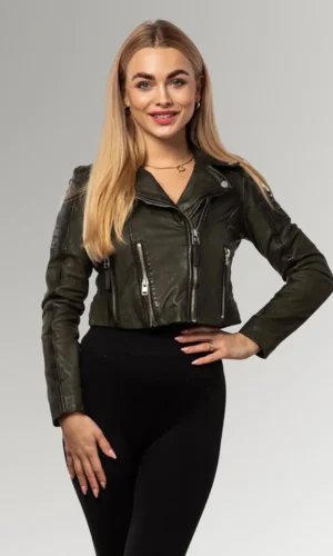 We are pleased to introduce the Olive Green Short-Length Biker Jacket for Women by Kathryn Manning. This jacket is constructed out of high-quality leather, and it has a front zipper fastening, a lapel collar, two pockets on the exterior, and one pocket on the interior. The sleeves are full length. While you are wearing this jacket, your body will remain comfy because it is lined with viscose.