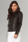 Those individuals who adore the texture of genuine leather will find that the Madeline Huber Women’s Black Biker Leather Jacket is the ideal jacket for their needs. The upright collar with the tap button lends an aura of elegance and class to your appearance. The snug fit is provided by the front zipper closing, and the four pockets on the exterior provide you with plenty of space to put your valuables. Because there is only one pocket on the inside, it will be quite convenient for you to store your essentials there.