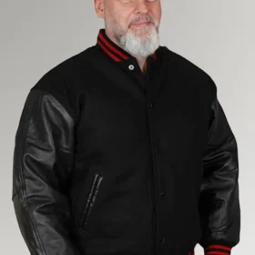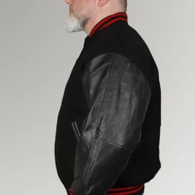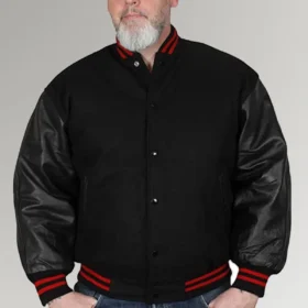 When designing the Olson jacket, the designer kept the respectability of the ensemble in mind. It is constructed of plush fleece that has been colored black, and the material that is used for its sleeves is leather. This ensures that it will keep you reasonably warm and comfortable during the colder months of the year. This jacket has a round neck collar that is ribbed and nicely knitted, and it has Scarlet Red lines on it. In addition to that, the cuffs have a ribbed design. The front of the jacket is designed with a button closing, which gives it a more casual appearance. This black jacket incorporates not one but two distinct styles: the classic and the biker. In addition, the waist line is ribbed and fitting, and the outer shell features two pockets on the sides. Consequently, don the Olson Black Baseball Jacket and make the most of this season.