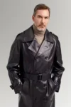 Patel Black Belted Buttoned Leather Blazer Trench Coat For Men’s