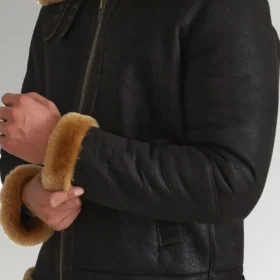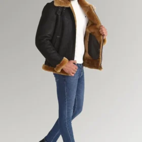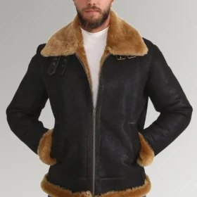 The hue of the jacket is a dreary black, and it is styled with shearling fur in a brown that contrasts with the color. The outer shell of the jacket is constructed entirely of genuine sheepskin leather, and the interior is lined with shearling, a soft fur, to ensure that you remain completely warm and protected from the chilly weather. The jacket provides you with two fashionable and deep outside pockets on both sides, allowing you to keep your essential belongings close at hand. This Aviator Flight jacket is designed with a zipper closing and a double strap buckle up style beneath its spread fur shearling collar, which together give the jacket an undeniably elegant appearance. On either side of the waist, you’ll find two adjustment belts for the fitting that offer you with command over the necessary fitting for your needs.