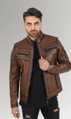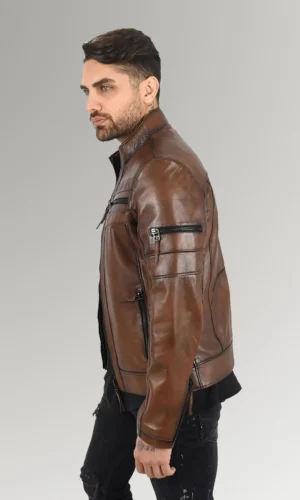 The Ross Men’s Brown Leather Jacket is one of the most popular brand-new things that are now on sale at The Super Jacket. It looks like a classic leather motorcycle jacket, which was the inspiration behind its design. This Sheepskin jacket is handcrafted from real genuine leather, and because the tailoring process is done by hand, it can be fitted to fit any body shape or size. The Sheepskin used in this jacket is genuine Sheepskin. This Ross Men’s Brown Waxed Biker Leather Jacket is the perfect choice for any event, whether it be personal or professional.